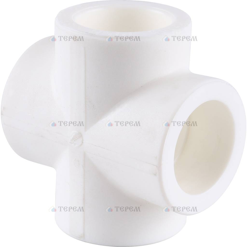 Крестовины из полипропилена используются для монтажа нескольких отрезков трубы в единую систему. Соединение фитинга с трубой производится с помощью термообработки паяльником.